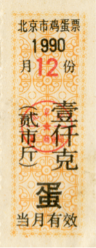 ● 1992年12月1日,北京市放开鸡蛋、蔬菜、肉价格,不用凭票购买。但是仍然发放购货本和粮、肉、油、蛋票。