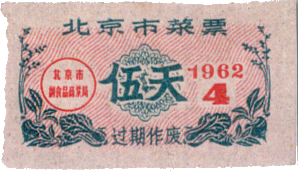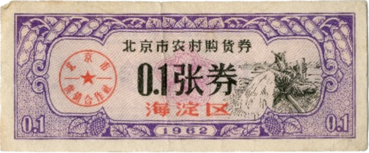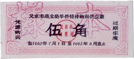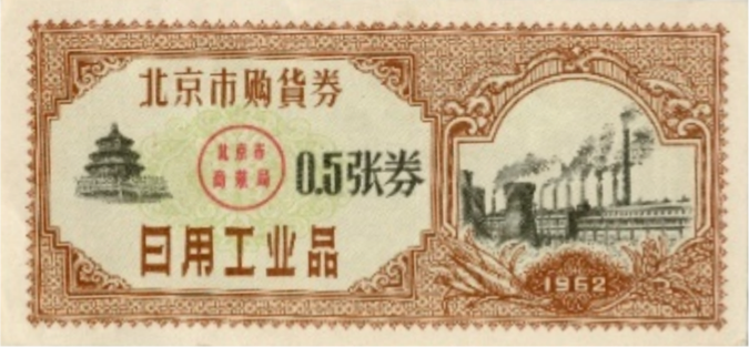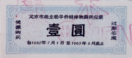 ● 1962年4月13日,发放购货券,规定:购货券由北京市商业局统一印制,以张为单位,不计金额,分“1张券”,“0.5张券”,“0.1张券”三种;向职工干部发放按每月工资收入,每20元发发购货券1张,不足20元部分每2元发给购货券0.1张,每月工资不满30元按30元计算发放;购货券由中国人民银行北京分行统一代理发行,本市1962年发出的购货券一律到1963年年底有效。