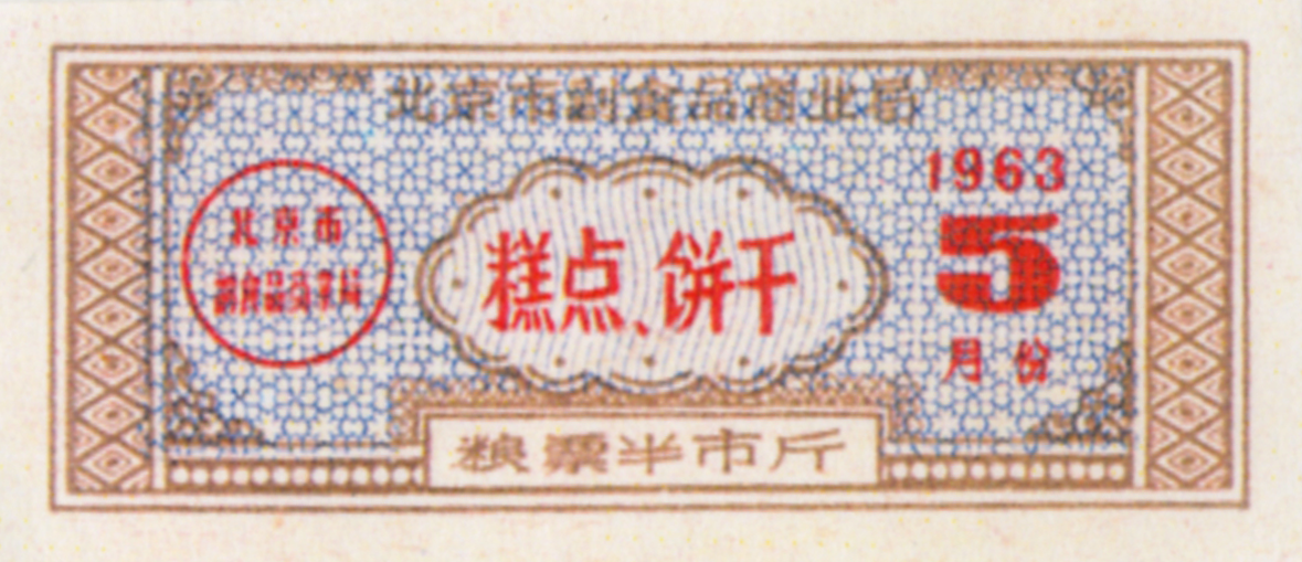● 1963年4月,合并糕点票和饼干票为糕点饼干票,每枚糕点饼干票可买糕点或饼干8市两,也可在粮店买面粉或粗粮0.5市斤。