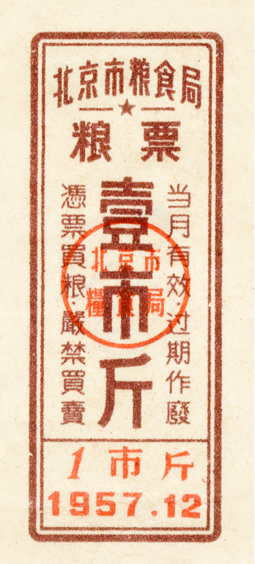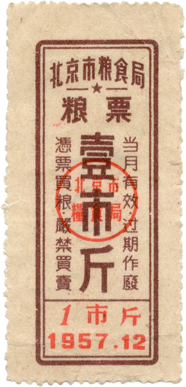 ● 1955年12月,北京市全市机关单位及居民全部实行按人定量办法,全部按照定量发放粮票、凭票购粮。本市粮票一律当月有效,粮店收回粮票加盖注销章。